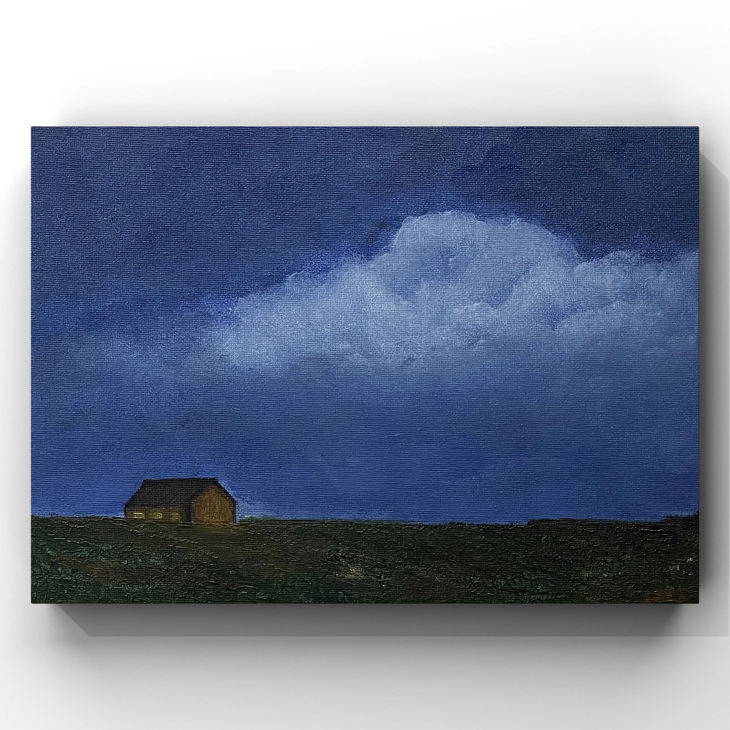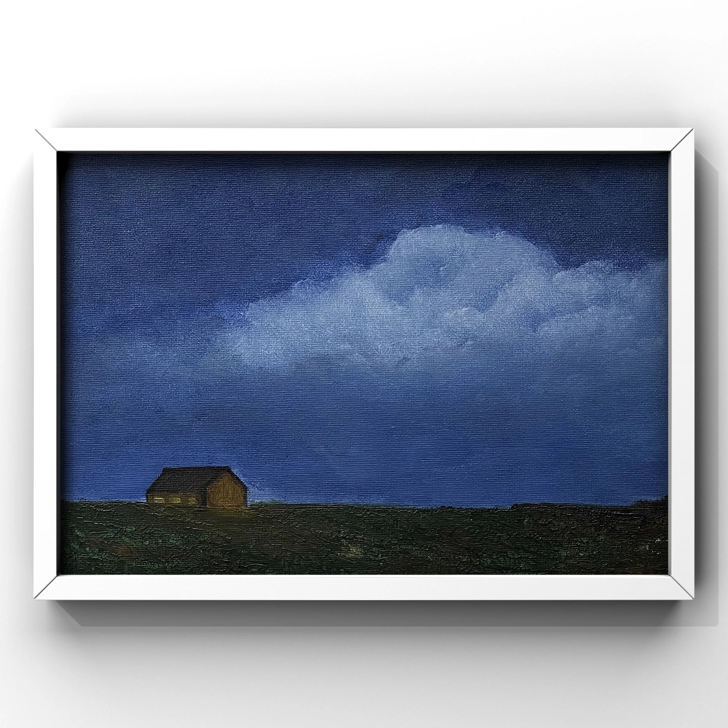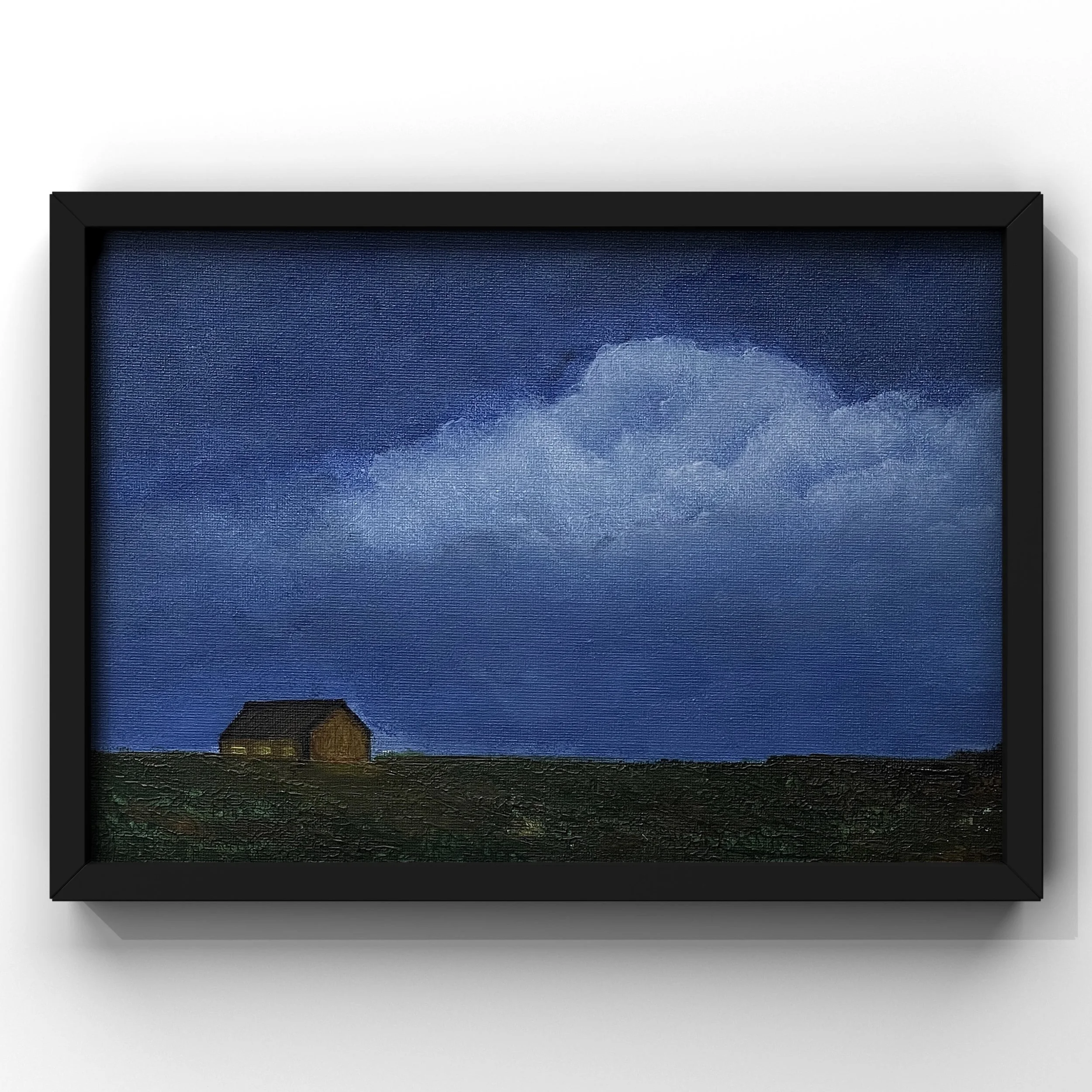 A house rests beneath deep blue clouds, surrounded by open night air.